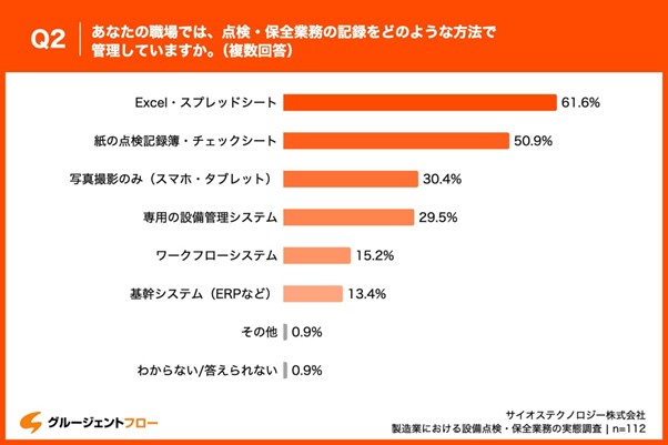 「Q2.あなたの職場では、点検・保全業務の記録をどのような方法で管理していますか。(複数回答)」と質問したところ、「Excel・スプレッドシート」が61.6%、「紙の点検記録簿・チェックシート」が50.9%、「写真撮影のみ(スマホ・タブレット)」が30.4%という回答となりました。