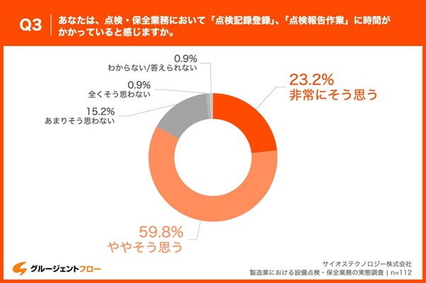 「Q3.あなたは、点検・保全業務において「点検記録登録」、「点検報告作業」に時間がかかっていると感じますか。」と質問したところ、「非常にそう思う」が23.2%、「ややそう思う」が59.8%という回答となりました。