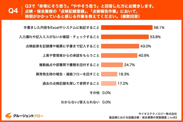 「Q4.Q3で「非常にそう思う」「ややそう思う」と回答した方にお聞きします。点検・保全業務の「点検記録登録」、「点検報告作業」において、時間がかかっていると感じる作業を教えてください。(複数回答)」と質問したところ、「手書きした内容をExcelやシステムに転記すること」が58.1%、「入力漏れや記入ミスがないか確認・チェックすること」が53.8%、「点検結果を記録簿や帳票に手書きで記入すること」が43.0%という回答となりました。