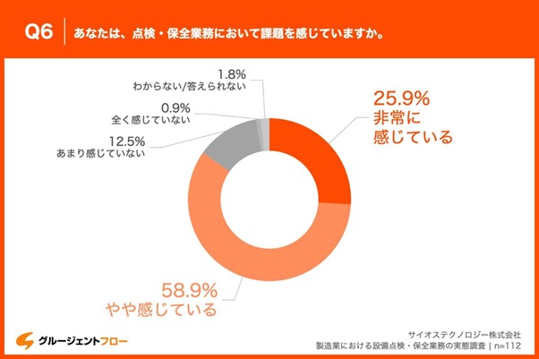 「Q6.あなたは、点検・保全業務において課題を感じていますか。」と質問したところ、「非常に感じている」が25.9%、「やや感じている」が58.9%という回答となりました。