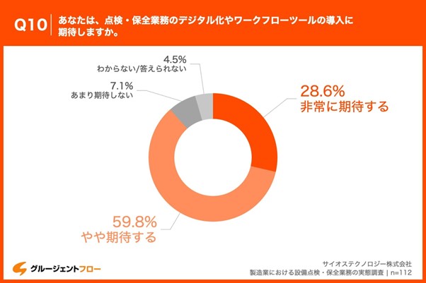「Q10.あなたは、点検・保全業務のデジタル化やワークフローシステムの導入に期待しますか。」と質問したところ、「非常に期待する」が28.6%、「やや期待する」が59.8%という回答となりました。