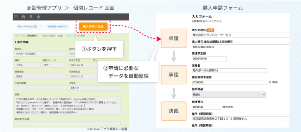 商談管理アプリからワークフローを起案。決裁後、売上管理アプリや顧客台帳へデータを自動転記。複数のアプリにまたがる更新作業が1クリックで完結します。