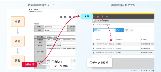 承認完了と同時に、kintone の「押印申請台帳アプリ」へ契約名や添付ファイルリンクを自動登録。管理台帳への転記の手間を削減します。